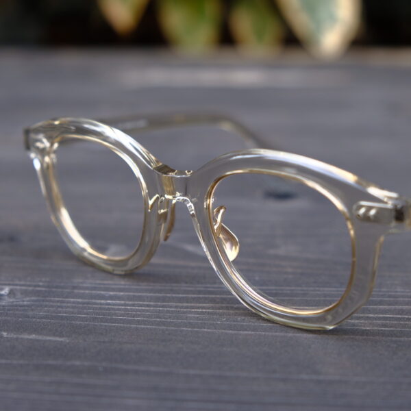 平らな湖面を思わせるフラットなブローラインと、水底の丸みを想起させるアンダーリム。この対比が、一本のフレームの中に「彫刻的な造形美」を描き出しています。