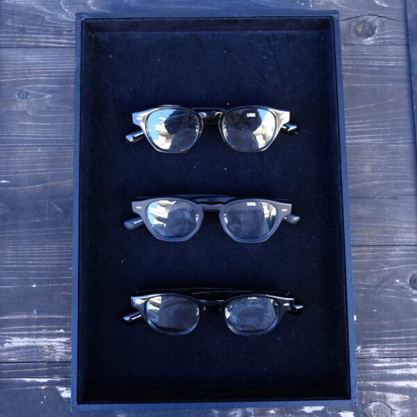 一方、YUICHI TOYAMA. は、伝統的な美しさをベースにしながら、驚くほどモダンなエッセンスが加えられています。「U-185」のような適度な厚みのあるセルフレームは、お顔の輪郭をはっきりとさせ、加齢による目元の緩みを視覚的にカバーしてくれます。
